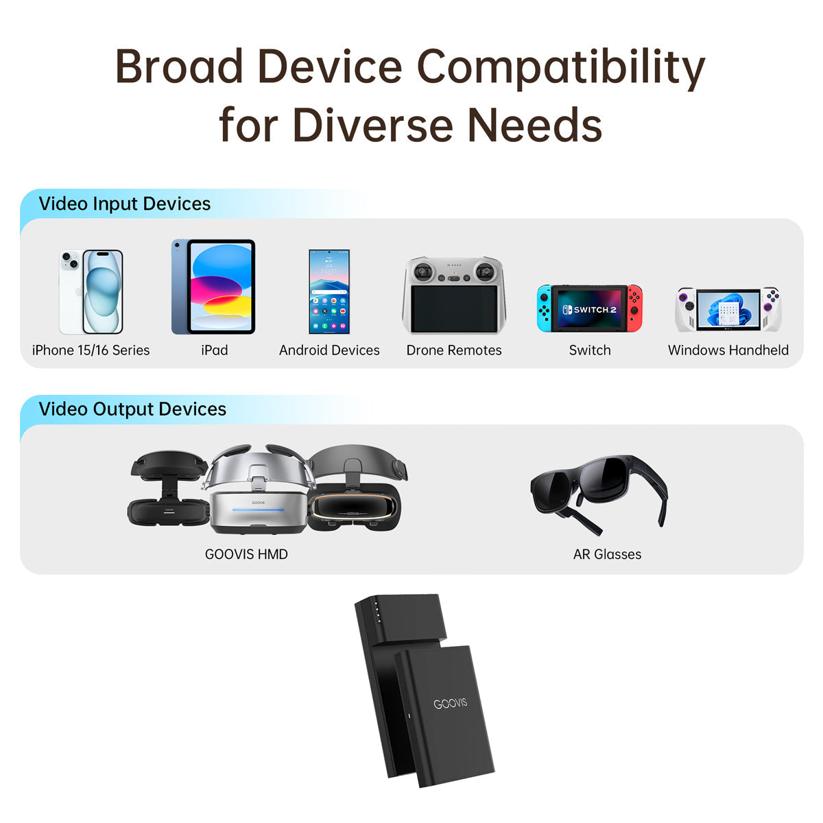 Compatible with gaming handhelds, smartphones and tablets with USB-C DP Alt Mode as video input devices, as well as GOOVIS headsets and AR glasses as video output display.